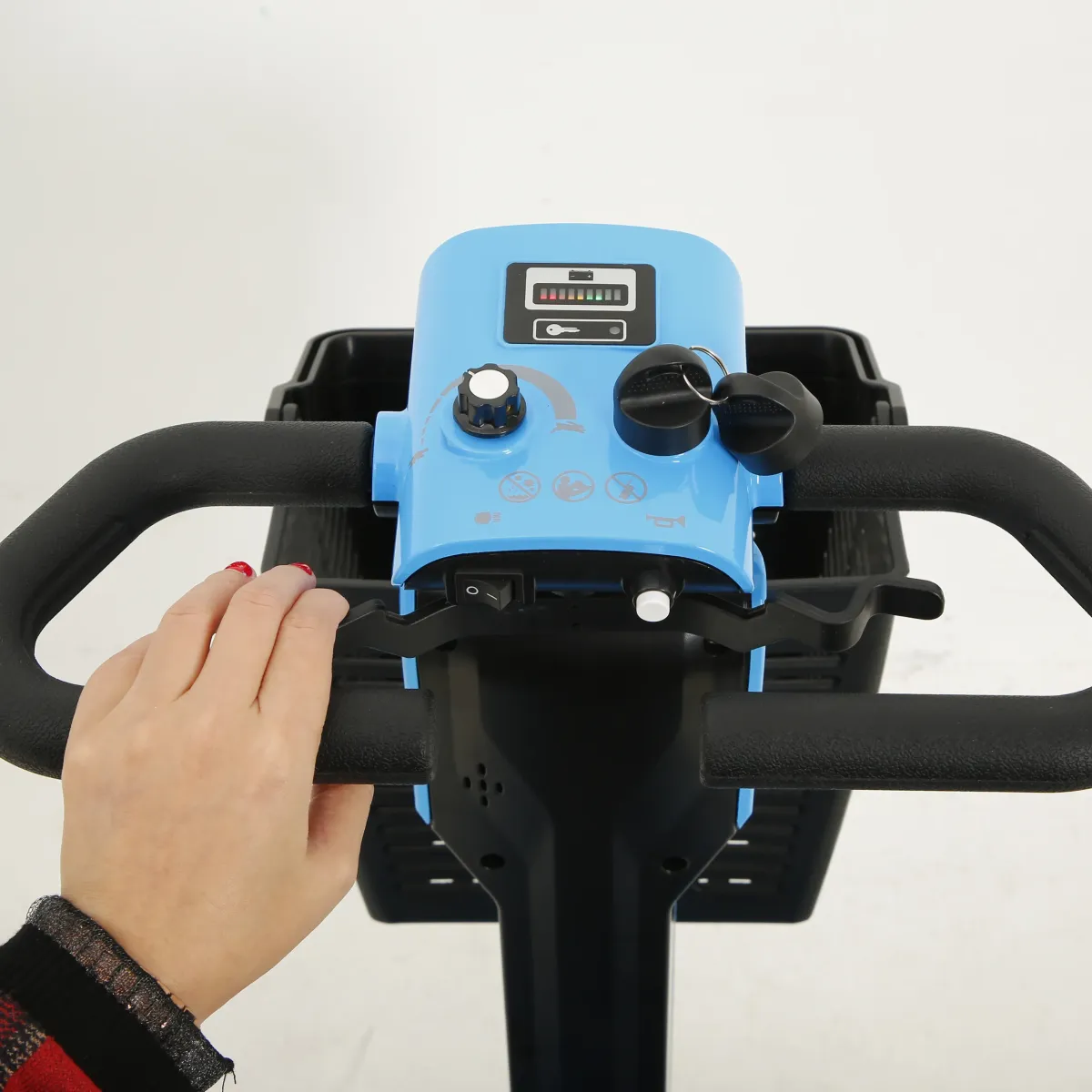 The Enduro compact mobility scooter is equipped with a user-friendly control panel conveniently located within reach of the rider. The panel includes a throttle lever & control dial to regulate speed, while a button is available for sounding the horn. The controls are designed to be intuitive and easy to operate, ensuring a smooth and safe ride.
